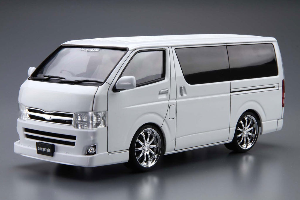 Transform the workhorse van into a street cruiser with Aoshima's 1/24 Boxystyle Hiace Super GL 2010 kit, featuring aero parts and adjustable suspension. This tuned version includes front spoiler, rear flat bumper, tailgate garnish, muffler, shift knob, bed system, 19-inch wheels, and screw/spring adjustable suspension. Window masking stickers included.