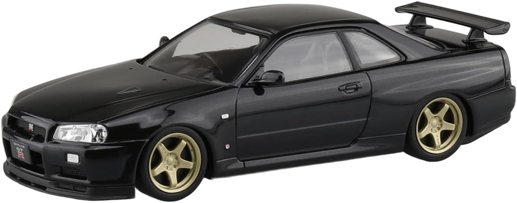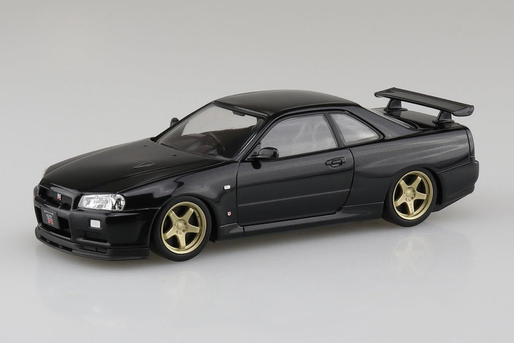 Present a commanding and sleek version of a definitive Japanese performance car with this simple snap kit. The Nissan R34 Skyline GT-R in deep Black Pearl comes equipped with custom 18-inch wheels, creating a sophisticated and aggressive model that assembles quickly for immediate display.