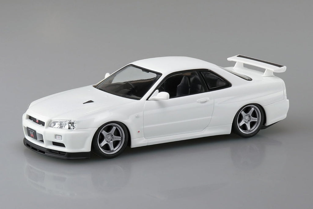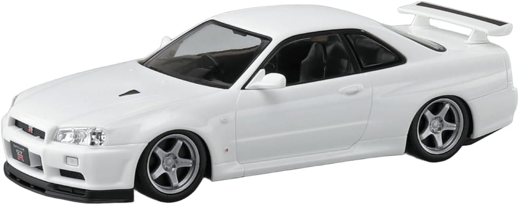 Reveal a brilliantly clean and customized JDM icon with this easy-to-assemble snap kit. The Nissan R34 Skyline GT-R in shimmering White Pearl comes fitted with custom 18-inch wheels, presenting a crisp, high-contrast model that looks exceptional displayed straight from the box.