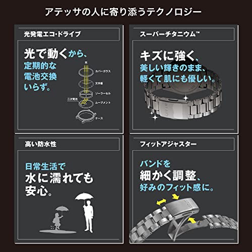 • 【人にやさしい機能・性能】光発電エコ・ドライブ搭載で手間いらず。わずかな太陽光や光を電気に変換します。一度フル充電すれば、光のないところでも長時間動き続けるので、定期的な電池交換は必要ありません。水仕事にも安心な10気圧防水。バンドの長さを微調整することができるフィットアジャスターも便利です。