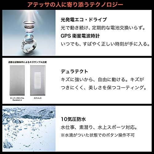 - 【チタニウムで次世代を進み続ける、シチズン ATTESA(アテッサ)】スタイリッシュで洗練されたデザインで人気の「ACT Line(アクトライン)」をベースに、さりげない光沢をまとうサファイアベゼルを採用したモデルが登場。アクティブなシーンにもビジネスシーンにもフィットするエコ・ドライブ搭載のGPS衛星電波時計です。