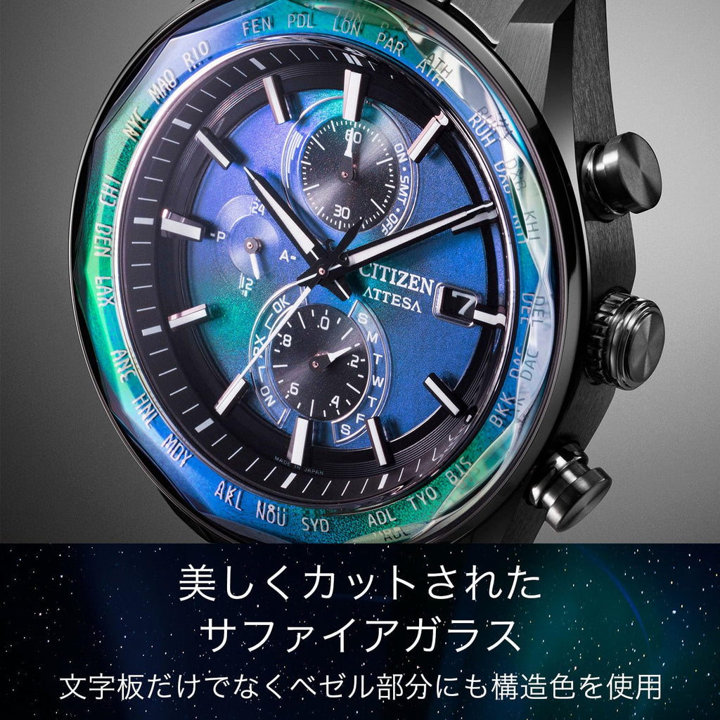 - 【サファイアガラスの輝きと構造色の色合いが織りなす、限定モデル】チタニウムで次世代を進み続ける、シチズン ATTESA(アテッサ)。風防のサファイアガラスがベゼル部分まで覆いつくす特殊な構造を開発。文字板とベゼルとの構造色が美しい限定モデルです。世界限定1,800本