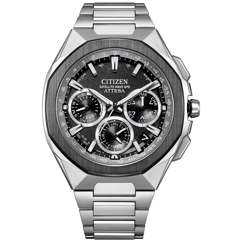 チタニウムで次世代を進み続ける、シチズン ATTESA(アテッサ)。八角形のベゼルはアテッサ初のセラミックス素材。更に、フルフローのケースに異形のプッシュボタンと、新しいスタイリングを採用。ソリッドで精悍な存在感を放つ、GPS衛星電波時計が登場。