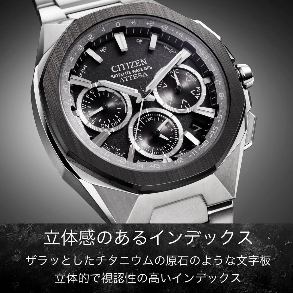 - 【八角形ベゼルのソリッドで精悍な存在感を放つ、GPS衛星電波時計】チタニウムで次世代を進み続ける、シチズン ATTESA(アテッサ)。チタニウムでは表現が難しい、極めて粗いヘアラインを施したアテッサ初のセラミックス製のベゼルを搭載。異素材を組み合わせたスタイリングがソリッドで精悍な印象を与えます。フルフローのケースに異形のプッシュボタンと、新しいスタイリングを採用した、今までと何もかもが違うルックスに仕上げました。