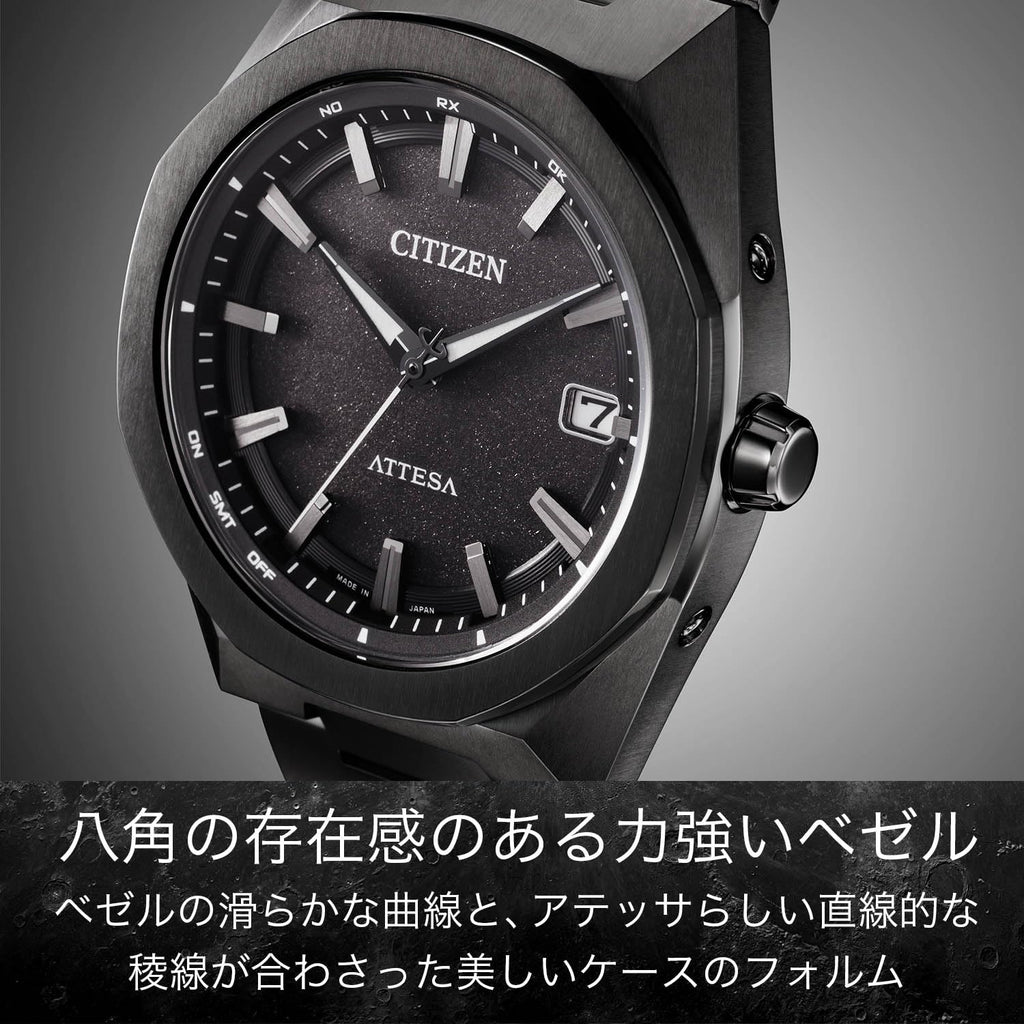 - 【八角形ベゼルが印象的な、力強くスポーティな電波時計】チタニウムで次世代を進み続ける、シチズン ATTESA(アテッサ)。力強い個性を演出する八角形のベゼルを搭載。ベゼルの滑らかな曲線と、アテッサらしい直線的な稜線をが合わさった美しいケースのフォルムが個性的です。小型ケースに対応可能なムーブメント「H128」を採用し、39.0mm径のコンパクトなサイズを実現しました。