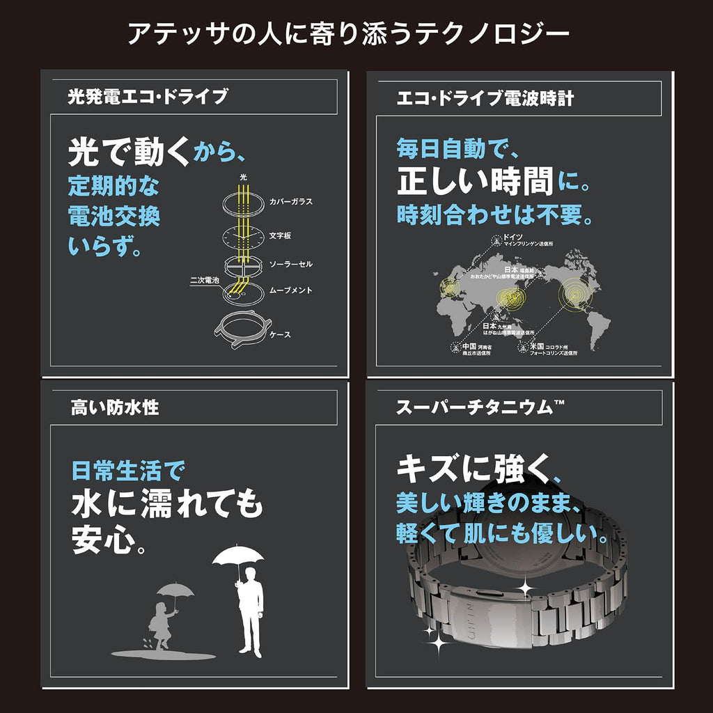 - 【頼れる機能・性能】定期的な電池交換不要のシチズン独自技術の光発電エコ・ドライブ搭載で手間いらず。どこにいても正確な時刻に同期する電波時計。キズに強く、軽く、サビにくいスーパーチタニウム。ブラックチタンシリーズ。キズがつきにくく透明度が高いサファイヤガラスに反射を抑えて、文字板を見やすくするコーティング(無反射コーティング)を採用。水仕事にも安心な10気圧防水。便利な日付、夜光つき(針)。フィットアジャスターはバンドの長さを微調整(約7mm)できます。