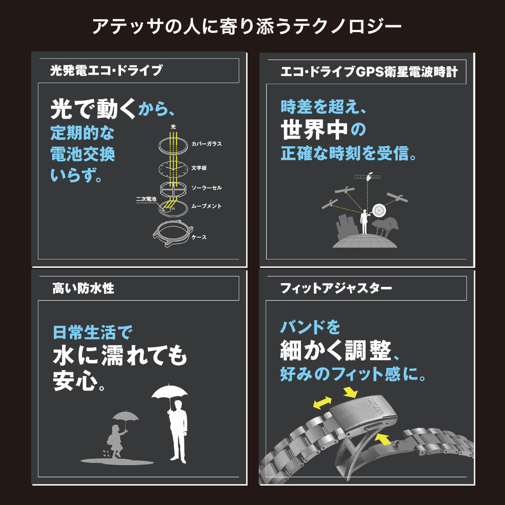 - 【頼れる機能・性能】定期的な電池交換不要のシチズン独自技術の光発電エコ・ドライブ搭載で手間いらず。どこにいても正確な時刻に同期するGPS衛星電波時計。キズに強く、サビにくいスーパーチタニウム、特にチタン素材の軽さは、多くのお客様に喜ばれているポイントです。さらに、キズがつきにくく透明度が高いサファイヤガラスに反射を抑えて、文字板を見やすくするコーティング(クラリティ・コーティング)を採用。水仕事にも安心な10気圧防水。便利な日付、夜光つき(針)。フィットアジャスターはバンドの長さを微調整(約7mm)できます。