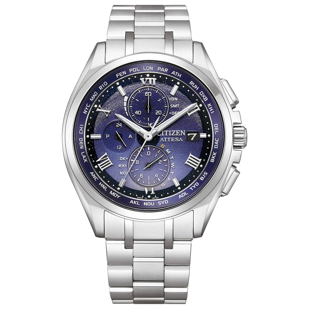 • 【チタニウムで次世代を進み続ける、シチズン ATTESA(アテッサ)】シルバーのラメが練り込まれたブルーの文字板に、インクジェットでアーチ状のグラデーションを描いた透明感のある仕上がり。12時位置方向にパールのプリントを何層にも重ね、夜に現れる虹のアーチをさりげなく溶け込ませています。外装にはデュラテクトプラチナを使用し、インデックスや時分針もシルバーで統一。全体の透明感を強調しながら、夜の静寂の中に浮かび上がる美しい情景を表現しました。