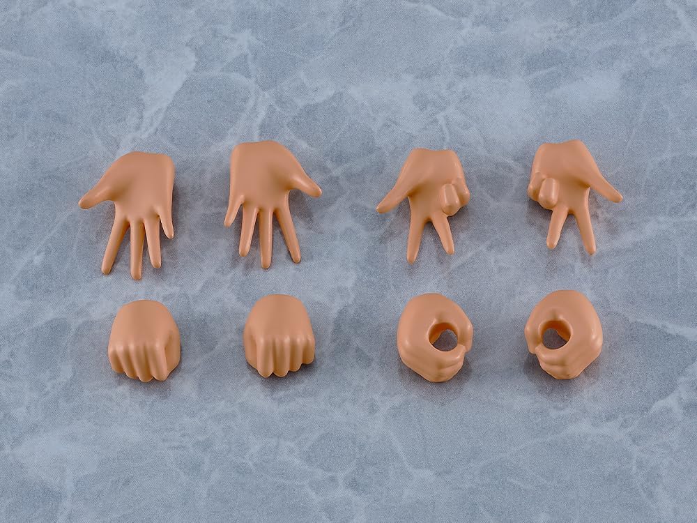 Comes with four pairs of interchangeable hands (closed, open, peace sign, gripping) featuring universal 3mm holes for holding accessories.