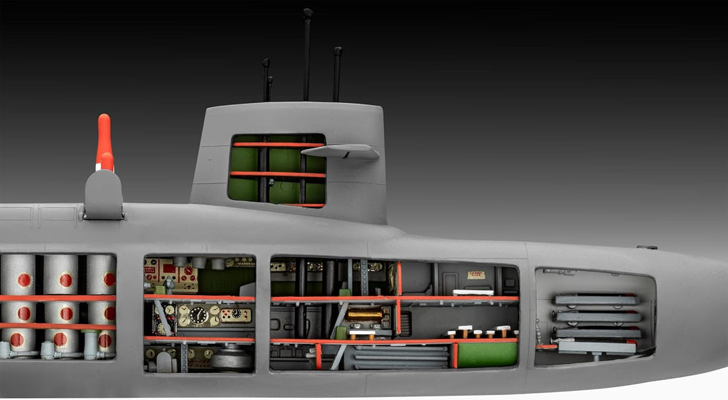 • A detailed cut-away design exposing the submarine's internal compartments and systems.