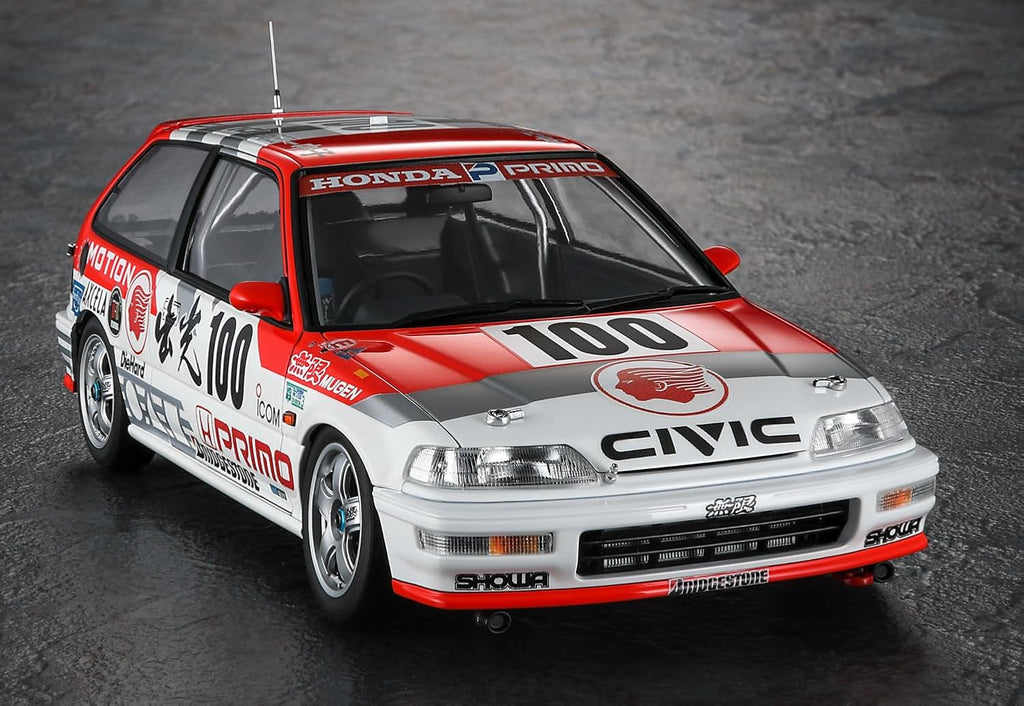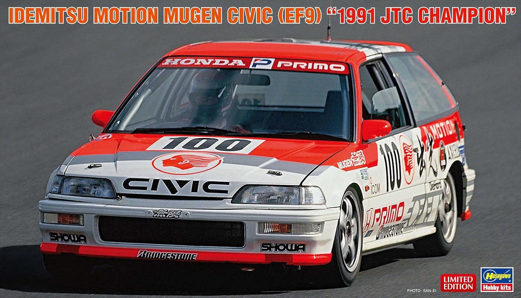 Celebrate touring car glory with the Hasegawa 20763 1/24 Idemitsu MOTION Mugen Civic (EF9) 1991 JTC Champion. This kit recreates the championship-winning machine driven by Osamu Nakako and Hideki Okada. New plastic parts include side mirrors, front/rear brake discs, dashboard, roll cage, exhaust, seat, steering wheel, wheels, antenna, and tires. Decals provide full markings for the No.100 Class Champion car from the 1991 All Japan Touring Car Championship.