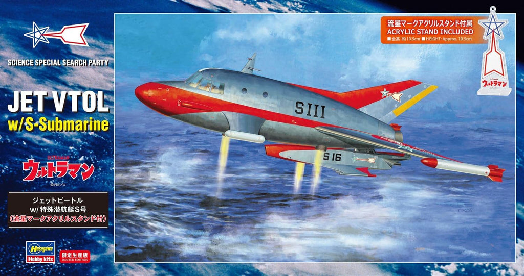 Soar into action with the Science Special Search Party in this special Hasegawa model kit. This limited edition 1/72 scale set features the iconic Jet VTOL from Ultraman, complete with the attachable Special Submarine S and a unique acrylic display stand featuring the famous meteor emblem, ready to be the highlight of any collection.