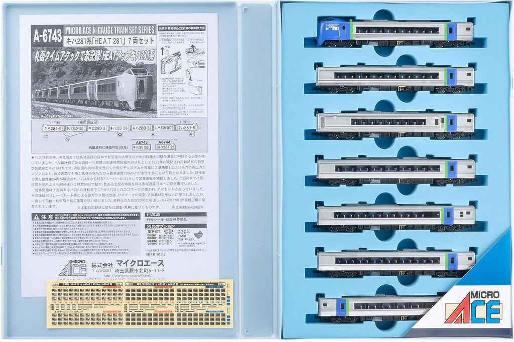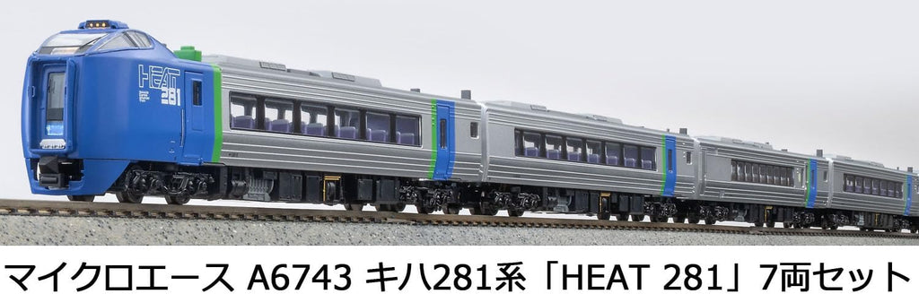 Journey into the world of luxury Hokkaido rail travel with this splendid seven-car set. This model presents the Kiha 281 series "Super Hokuto" in its special HEAT 281 promotional livery, featuring a refined blue and silver color scheme and the distinctive logo that marks its celebratory status.