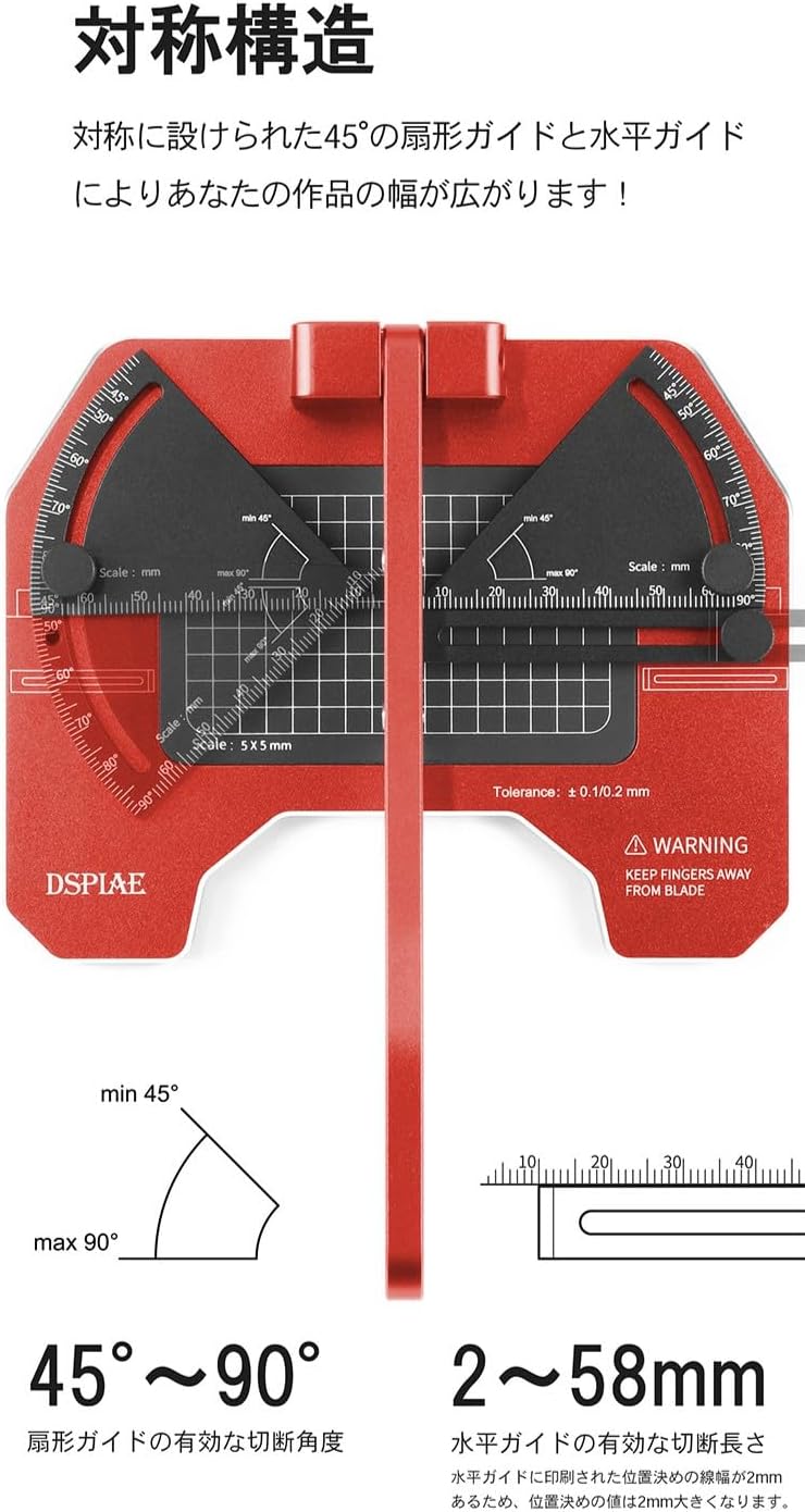 Utilizes a combination of horizontal and 45° mirrored guide plates for precise symmetrical cuts.