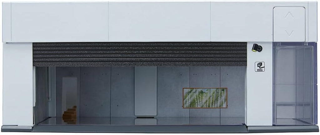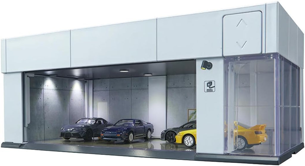 Elevate your Tomica collection with this premium garage display unit featuring motorized shutters that open and close with a touch—just like a real garage door. Watch the interior lights automatically illuminate when the shutter rises and dim when it closes, creating an immersive display experience. The sleek silver-white finish complements any collection space, while three customizable interior design paper sets let you personalize walls and floors to match your aesthetic. Perfect for showcasing your mini-car collection with style and sophistication. Tomica vehicles sold separately.