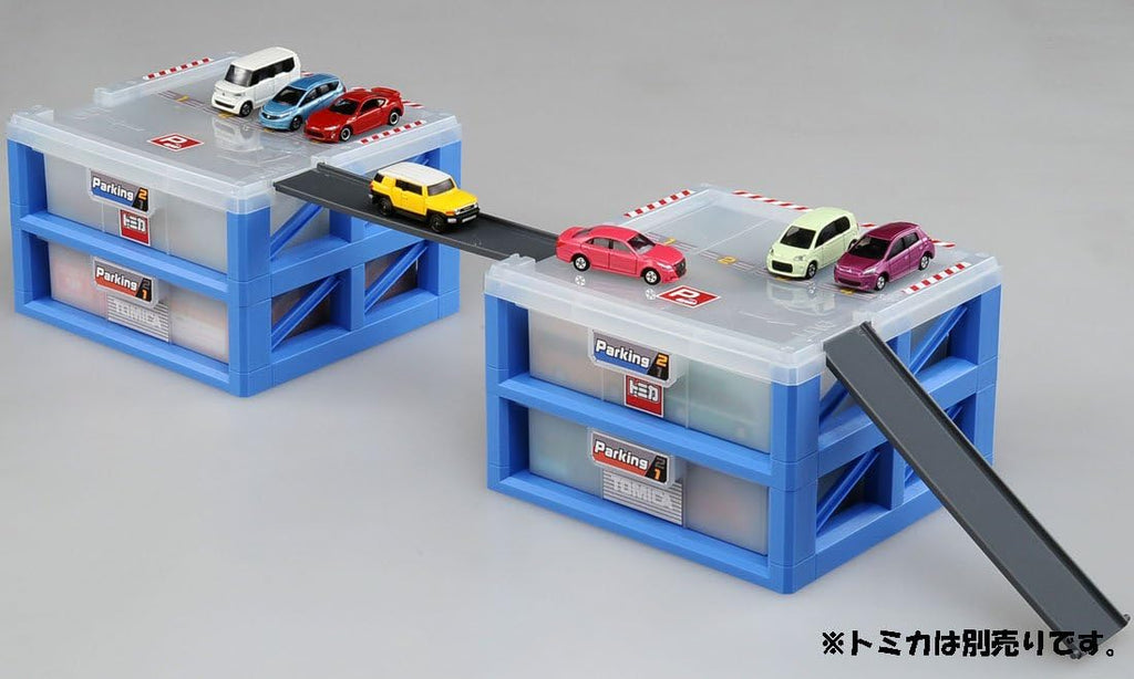 Store and display your Tomica collection with style. This dual-purpose parking case features two spacious drawers with internal partitions to organize 20+ vehicles neatly, while the top surface transforms into an active play zone. The included slope and bridge let you stage parking scenarios and traffic scenes instantly. Stack multiple cases to build your ultimate Tomica garage—each unit locks securely to the next, creating a modular system that grows with your collection. Designed for collectors who refuse to choose between organization and play.