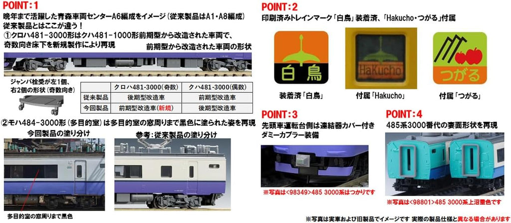 Secure a distinguished piece of JR limited express history, captured in its final definitive form. This high-grade TOMIX set presents the elegant Series 485-3000 "Hakuchō" in its late-era A6 formation, complete with authentic gray undercarriages and period-specific details that marked its twilight years of service across the Tsugaru Strait.